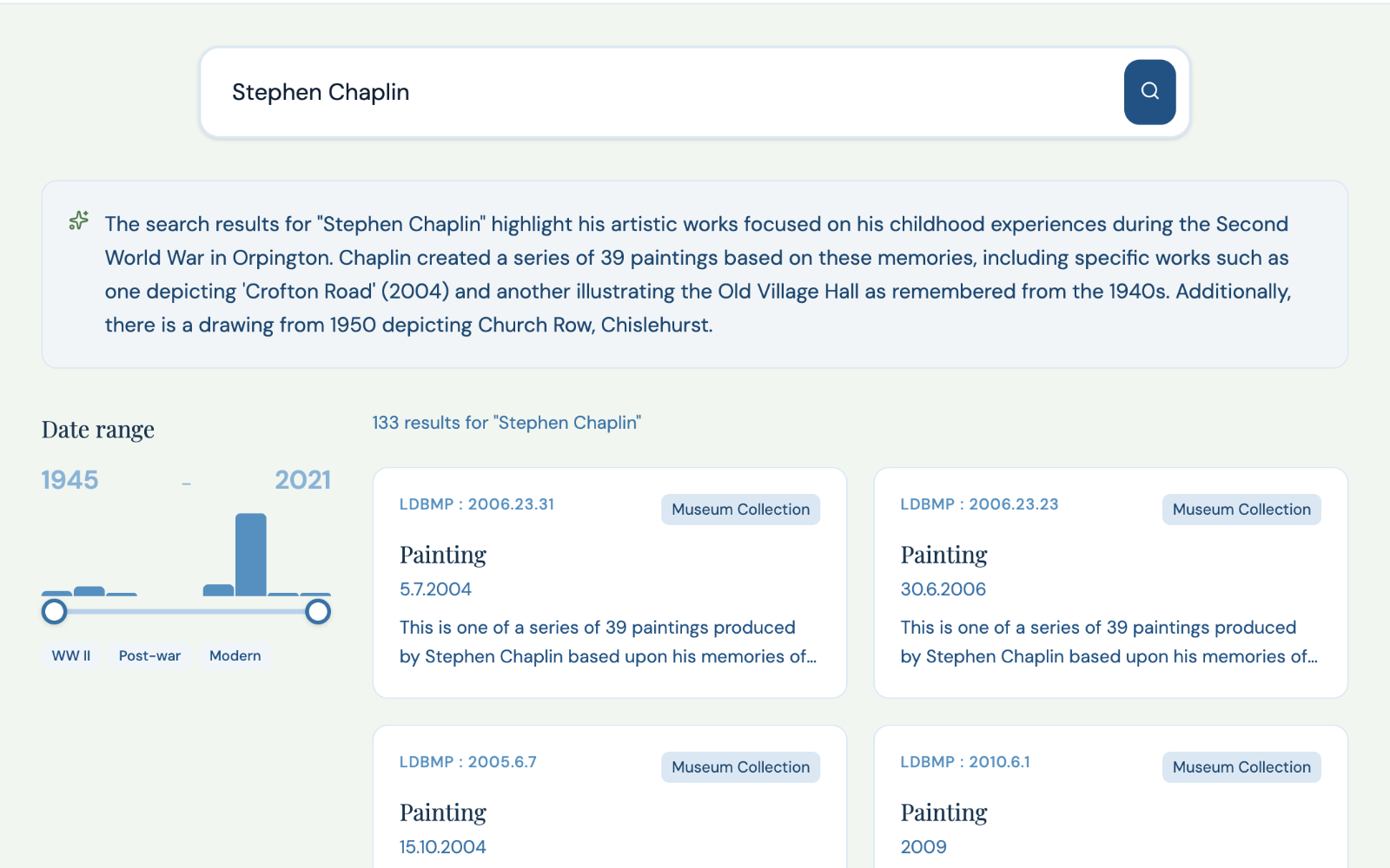 Visitors search the way they think, not the way your catalogue is organised. Natural language queries and date filters surface material that keyword search would miss — fewer dead ends, more discovery.
