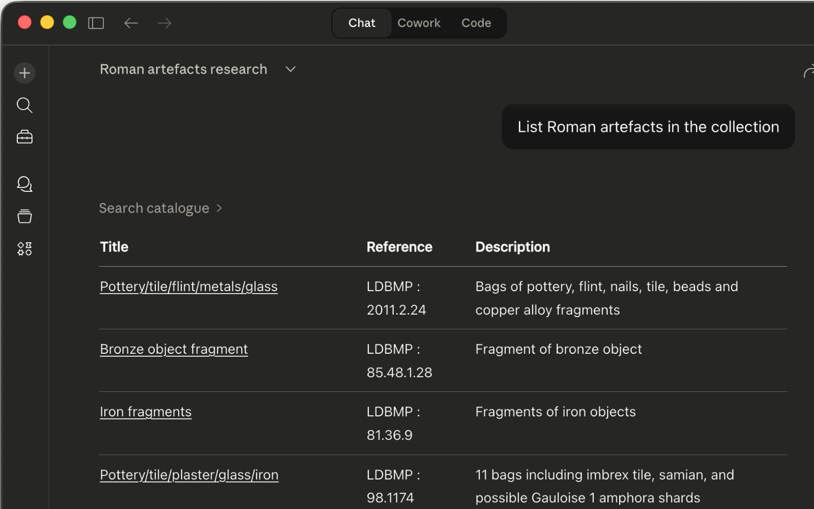 Your catalogue becomes a research tool inside Claude Desktop — the AI assistant millions of researchers already use. Interrogate your collection in natural language, with results tied back to your own records.
