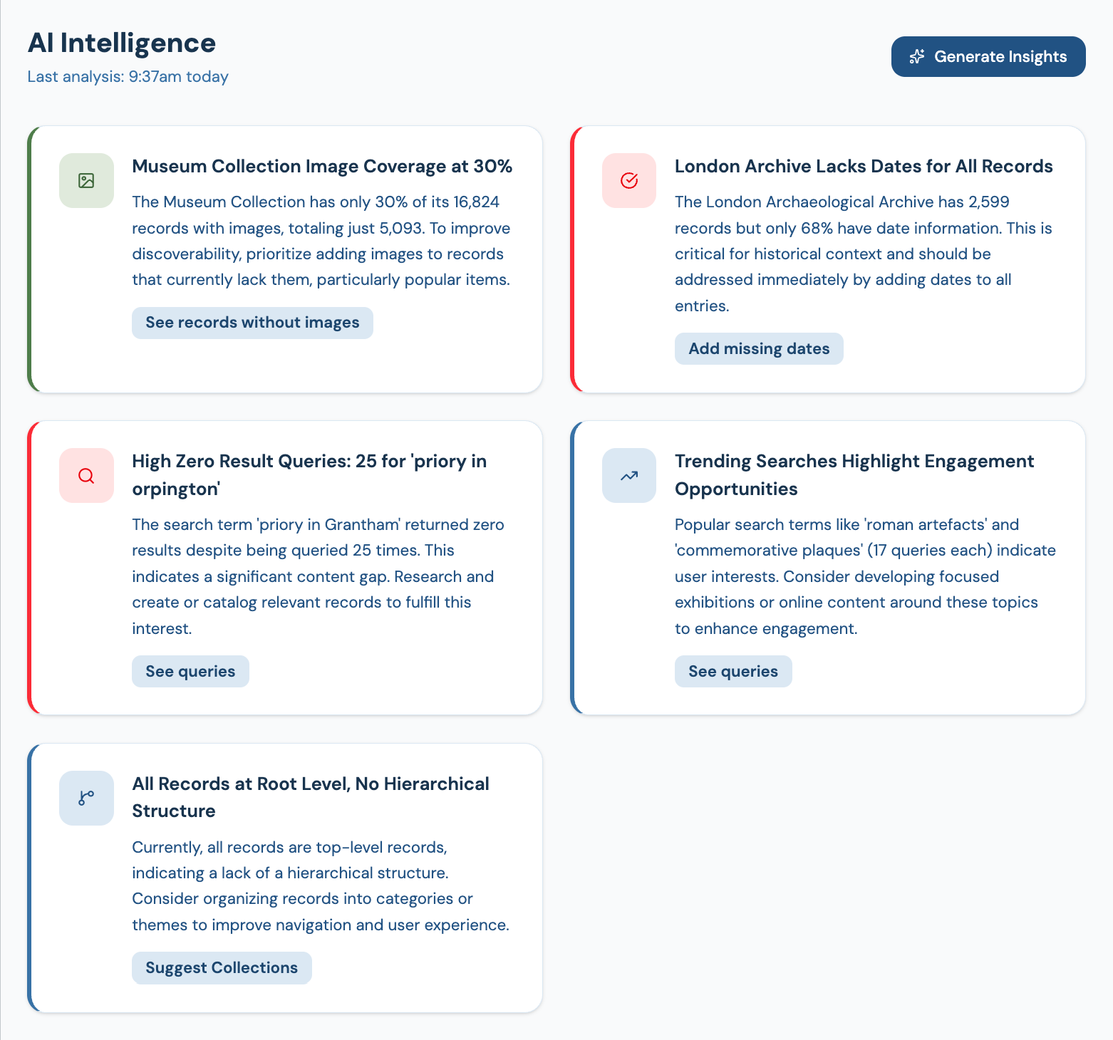 Know what your visitors are searching for, which collections drive engagement, and where metadata gaps are making records harder to find. Evidence from real behaviour, not guesswork.